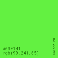Цвет #63F141 в цветовой модели RGB обозначается тремя октетами (99, 241, 65) в десятичном формате и #63F141 в шестнадцатиричном (hex) формате, которые являются интенсивностью красного 99 (hex 63), интенсивность зелёного 241 (hex F1) и интенсивность синего 65 (hex 41).