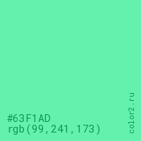 Цвет #63F1AD в цветовой модели RGB обозначается тремя октетами (99, 241, 173) в десятичном формате и #63F1AD в шестнадцатиричном (hex) формате, которые являются интенсивностью красного 99 (hex 63), интенсивность зелёного 241 (hex F1) и интенсивность синего 173 (hex AD).