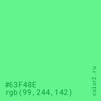 Цвет #63F48E в цветовой модели RGB обозначается тремя октетами (99, 244, 142) в десятичном формате и #63F48E в шестнадцатиричном (hex) формате, которые являются интенсивностью красного 99 (hex 63), интенсивность зелёного 244 (hex F4) и интенсивность синего 142 (hex 8E).
