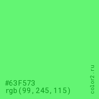 Цвет #63F573 в цветовой модели RGB обозначается тремя октетами (99, 245, 115) в десятичном формате и #63F573 в шестнадцатиричном (hex) формате, которые являются интенсивностью красного 99 (hex 63), интенсивность зелёного 245 (hex F5) и интенсивность синего 115 (hex 73).
