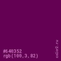 Цвет #640352 в цветовой модели RGB обозначается тремя октетами (100, 3, 82) в десятичном формате и #640352 в шестнадцатиричном (hex) формате, которые являются интенсивностью красного 100 (hex 64), интенсивность зелёного 3 (hex 03) и интенсивность синего 82 (hex 52).