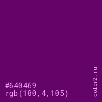 Цвет #640469 в цветовой модели RGB обозначается тремя октетами (100, 4, 105) в десятичном формате и #640469 в шестнадцатиричном (hex) формате, которые являются интенсивностью красного 100 (hex 64), интенсивность зелёного 4 (hex 04) и интенсивность синего 105 (hex 69).