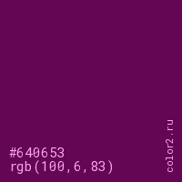 Цвет #640653 в цветовой модели RGB обозначается тремя октетами (100, 6, 83) в десятичном формате и #640653 в шестнадцатиричном (hex) формате, которые являются интенсивностью красного 100 (hex 64), интенсивность зелёного 6 (hex 06) и интенсивность синего 83 (hex 53).