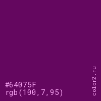 Цвет #64075F в цветовой модели RGB обозначается тремя октетами (100, 7, 95) в десятичном формате и #64075F в шестнадцатиричном (hex) формате, которые являются интенсивностью красного 100 (hex 64), интенсивность зелёного 7 (hex 07) и интенсивность синего 95 (hex 5F).