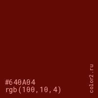 Цвет #640A04 в цветовой модели RGB обозначается тремя октетами (100, 10, 4) в десятичном формате и #640A04 в шестнадцатиричном (hex) формате, которые являются интенсивностью красного 100 (hex 64), интенсивность зелёного 10 (hex 0A) и интенсивность синего 4 (hex 04).