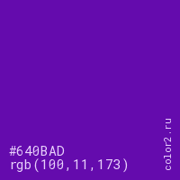Цвет #640BAD в цветовой модели RGB обозначается тремя октетами (100, 11, 173) в десятичном формате и #640BAD в шестнадцатиричном (hex) формате, которые являются интенсивностью красного 100 (hex 64), интенсивность зелёного 11 (hex 0B) и интенсивность синего 173 (hex AD).