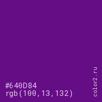 Цвет #640D84 в цветовой модели RGB обозначается тремя октетами (100, 13, 132) в десятичном формате и #640D84 в шестнадцатиричном (hex) формате, которые являются интенсивностью красного 100 (hex 64), интенсивность зелёного 13 (hex 0D) и интенсивность синего 132 (hex 84).