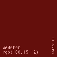 Цвет #640F0C в цветовой модели RGB обозначается тремя октетами (100, 15, 12) в десятичном формате и #640F0C в шестнадцатиричном (hex) формате, которые являются интенсивностью красного 100 (hex 64), интенсивность зелёного 15 (hex 0F) и интенсивность синего 12 (hex 0C).