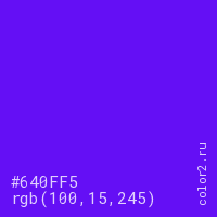Цвет #640FF5 в цветовой модели RGB обозначается тремя октетами (100, 15, 245) в десятичном формате и #640FF5 в шестнадцатиричном (hex) формате, которые являются интенсивностью красного 100 (hex 64), интенсивность зелёного 15 (hex 0F) и интенсивность синего 245 (hex F5).