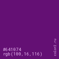 Цвет #641074 в цветовой модели RGB обозначается тремя октетами (100, 16, 116) в десятичном формате и #641074 в шестнадцатиричном (hex) формате, которые являются интенсивностью красного 100 (hex 64), интенсивность зелёного 16 (hex 10) и интенсивность синего 116 (hex 74).