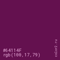 Цвет #64114F в цветовой модели RGB обозначается тремя октетами (100, 17, 79) в десятичном формате и #64114F в шестнадцатиричном (hex) формате, которые являются интенсивностью красного 100 (hex 64), интенсивность зелёного 17 (hex 11) и интенсивность синего 79 (hex 4F).