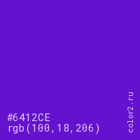 Цвет #6412CE в цветовой модели RGB обозначается тремя октетами (100, 18, 206) в десятичном формате и #6412CE в шестнадцатиричном (hex) формате, которые являются интенсивностью красного 100 (hex 64), интенсивность зелёного 18 (hex 12) и интенсивность синего 206 (hex CE).
