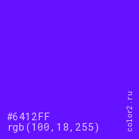 Цвет #6412FF в цветовой модели RGB обозначается тремя октетами (100, 18, 255) в десятичном формате и #6412FF в шестнадцатиричном (hex) формате, которые являются интенсивностью красного 100 (hex 64), интенсивность зелёного 18 (hex 12) и интенсивность синего 255 (hex FF).