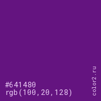 Цвет #641480 в цветовой модели RGB обозначается тремя октетами (100, 20, 128) в десятичном формате и #641480 в шестнадцатиричном (hex) формате, которые являются интенсивностью красного 100 (hex 64), интенсивность зелёного 20 (hex 14) и интенсивность синего 128 (hex 80).