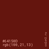 Цвет #64150D в цветовой модели RGB обозначается тремя октетами (100, 21, 13) в десятичном формате и #64150D в шестнадцатиричном (hex) формате, которые являются интенсивностью красного 100 (hex 64), интенсивность зелёного 21 (hex 15) и интенсивность синего 13 (hex 0D).