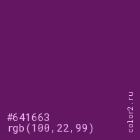 Цвет #641663 в цветовой модели RGB обозначается тремя октетами (100, 22, 99) в десятичном формате и #641663 в шестнадцатиричном (hex) формате, которые являются интенсивностью красного 100 (hex 64), интенсивность зелёного 22 (hex 16) и интенсивность синего 99 (hex 63).