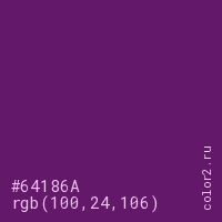 Цвет #64186A в цветовой модели RGB обозначается тремя октетами (100, 24, 106) в десятичном формате и #64186A в шестнадцатиричном (hex) формате, которые являются интенсивностью красного 100 (hex 64), интенсивность зелёного 24 (hex 18) и интенсивность синего 106 (hex 6A).