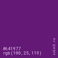 Цвет #641977 в цветовой модели RGB обозначается тремя октетами (100, 25, 119) в десятичном формате и #641977 в шестнадцатиричном (hex) формате, которые являются интенсивностью красного 100 (hex 64), интенсивность зелёного 25 (hex 19) и интенсивность синего 119 (hex 77).