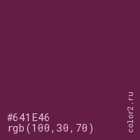 Цвет #641E46 в цветовой модели RGB обозначается тремя октетами (100, 30, 70) в десятичном формате и #641E46 в шестнадцатиричном (hex) формате, которые являются интенсивностью красного 100 (hex 64), интенсивность зелёного 30 (hex 1E) и интенсивность синего 70 (hex 46).