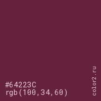 Цвет #64223C в цветовой модели RGB обозначается тремя октетами (100, 34, 60) в десятичном формате и #64223C в шестнадцатиричном (hex) формате, которые являются интенсивностью красного 100 (hex 64), интенсивность зелёного 34 (hex 22) и интенсивность синего 60 (hex 3C).