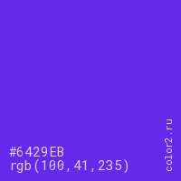 Цвет #6429EB в цветовой модели RGB обозначается тремя октетами (100, 41, 235) в десятичном формате и #6429EB в шестнадцатиричном (hex) формате, которые являются интенсивностью красного 100 (hex 64), интенсивность зелёного 41 (hex 29) и интенсивность синего 235 (hex EB).