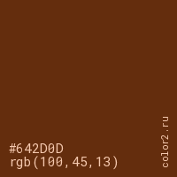 Цвет #642D0D в цветовой модели RGB обозначается тремя октетами (100, 45, 13) в десятичном формате и #642D0D в шестнадцатиричном (hex) формате, которые являются интенсивностью красного 100 (hex 64), интенсивность зелёного 45 (hex 2D) и интенсивность синего 13 (hex 0D).