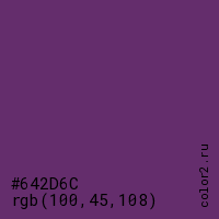 Цвет #642D6C в цветовой модели RGB обозначается тремя октетами (100, 45, 108) в десятичном формате и #642D6C в шестнадцатиричном (hex) формате, которые являются интенсивностью красного 100 (hex 64), интенсивность зелёного 45 (hex 2D) и интенсивность синего 108 (hex 6C).