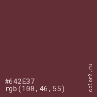 Цвет #642E37 в цветовой модели RGB обозначается тремя октетами (100, 46, 55) в десятичном формате и #642E37 в шестнадцатиричном (hex) формате, которые являются интенсивностью красного 100 (hex 64), интенсивность зелёного 46 (hex 2E) и интенсивность синего 55 (hex 37).