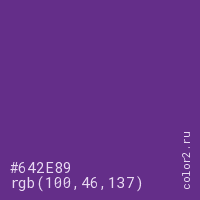 Цвет #642E89 в цветовой модели RGB обозначается тремя октетами (100, 46, 137) в десятичном формате и #642E89 в шестнадцатиричном (hex) формате, которые являются интенсивностью красного 100 (hex 64), интенсивность зелёного 46 (hex 2E) и интенсивность синего 137 (hex 89).