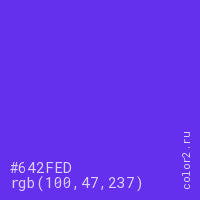 Цвет #642FED в цветовой модели RGB обозначается тремя октетами (100, 47, 237) в десятичном формате и #642FED в шестнадцатиричном (hex) формате, которые являются интенсивностью красного 100 (hex 64), интенсивность зелёного 47 (hex 2F) и интенсивность синего 237 (hex ED).