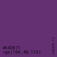 Цвет #643071 в цветовой модели RGB обозначается тремя октетами (100, 48, 113) в десятичном формате и #643071 в шестнадцатиричном (hex) формате, которые являются интенсивностью красного 100 (hex 64), интенсивность зелёного 48 (hex 30) и интенсивность синего 113 (hex 71).