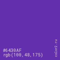 Цвет #6430AF в цветовой модели RGB обозначается тремя октетами (100, 48, 175) в десятичном формате и #6430AF в шестнадцатиричном (hex) формате, которые являются интенсивностью красного 100 (hex 64), интенсивность зелёного 48 (hex 30) и интенсивность синего 175 (hex AF).