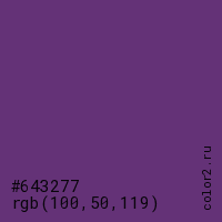 Цвет #643277 в цветовой модели RGB обозначается тремя октетами (100, 50, 119) в десятичном формате и #643277 в шестнадцатиричном (hex) формате, которые являются интенсивностью красного 100 (hex 64), интенсивность зелёного 50 (hex 32) и интенсивность синего 119 (hex 77).