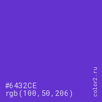Цвет #6432CE в цветовой модели RGB обозначается тремя октетами (100, 50, 206) в десятичном формате и #6432CE в шестнадцатиричном (hex) формате, которые являются интенсивностью красного 100 (hex 64), интенсивность зелёного 50 (hex 32) и интенсивность синего 206 (hex CE).