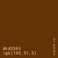 Цвет #643305 в цветовой модели RGB обозначается тремя октетами (100, 51, 5) в десятичном формате и #643305 в шестнадцатиричном (hex) формате, которые являются интенсивностью красного 100 (hex 64), интенсивность зелёного 51 (hex 33) и интенсивность синего 5 (hex 05).
