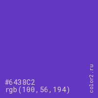 Цвет #6438C2 в цветовой модели RGB обозначается тремя октетами (100, 56, 194) в десятичном формате и #6438C2 в шестнадцатиричном (hex) формате, которые являются интенсивностью красного 100 (hex 64), интенсивность зелёного 56 (hex 38) и интенсивность синего 194 (hex C2).