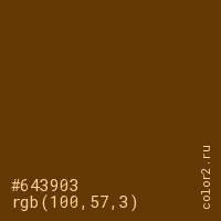 Цвет #643903 в цветовой модели RGB обозначается тремя октетами (100, 57, 3) в десятичном формате и #643903 в шестнадцатиричном (hex) формате, которые являются интенсивностью красного 100 (hex 64), интенсивность зелёного 57 (hex 39) и интенсивность синего 3 (hex 03).