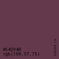 Цвет #64394B в цветовой модели RGB обозначается тремя октетами (100, 57, 75) в десятичном формате и #64394B в шестнадцатиричном (hex) формате, которые являются интенсивностью красного 100 (hex 64), интенсивность зелёного 57 (hex 39) и интенсивность синего 75 (hex 4B).