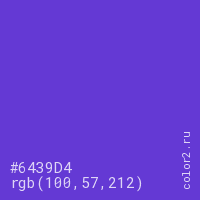 Цвет #6439D4 в цветовой модели RGB обозначается тремя октетами (100, 57, 212) в десятичном формате и #6439D4 в шестнадцатиричном (hex) формате, которые являются интенсивностью красного 100 (hex 64), интенсивность зелёного 57 (hex 39) и интенсивность синего 212 (hex D4).