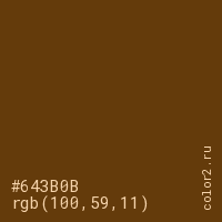 Цвет #643B0B в цветовой модели RGB обозначается тремя октетами (100, 59, 11) в десятичном формате и #643B0B в шестнадцатиричном (hex) формате, которые являются интенсивностью красного 100 (hex 64), интенсивность зелёного 59 (hex 3B) и интенсивность синего 11 (hex 0B).