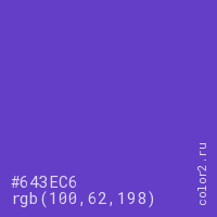 Цвет #643EC6 в цветовой модели RGB обозначается тремя октетами (100, 62, 198) в десятичном формате и #643EC6 в шестнадцатиричном (hex) формате, которые являются интенсивностью красного 100 (hex 64), интенсивность зелёного 62 (hex 3E) и интенсивность синего 198 (hex C6).
