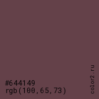 Цвет #644149 в цветовой модели RGB обозначается тремя октетами (100, 65, 73) в десятичном формате и #644149 в шестнадцатиричном (hex) формате, которые являются интенсивностью красного 100 (hex 64), интенсивность зелёного 65 (hex 41) и интенсивность синего 73 (hex 49).