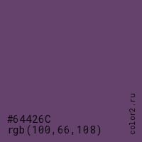 Цвет #64426C в цветовой модели RGB обозначается тремя октетами (100, 66, 108) в десятичном формате и #64426C в шестнадцатиричном (hex) формате, которые являются интенсивностью красного 100 (hex 64), интенсивность зелёного 66 (hex 42) и интенсивность синего 108 (hex 6C).