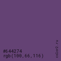 Цвет #644274 в цветовой модели RGB обозначается тремя октетами (100, 66, 116) в десятичном формате и #644274 в шестнадцатиричном (hex) формате, которые являются интенсивностью красного 100 (hex 64), интенсивность зелёного 66 (hex 42) и интенсивность синего 116 (hex 74).