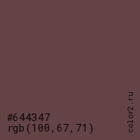 Цвет #644347 в цветовой модели RGB обозначается тремя октетами (100, 67, 71) в десятичном формате и #644347 в шестнадцатиричном (hex) формате, которые являются интенсивностью красного 100 (hex 64), интенсивность зелёного 67 (hex 43) и интенсивность синего 71 (hex 47).