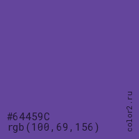 Цвет #64459C в цветовой модели RGB обозначается тремя октетами (100, 69, 156) в десятичном формате и #64459C в шестнадцатиричном (hex) формате, которые являются интенсивностью красного 100 (hex 64), интенсивность зелёного 69 (hex 45) и интенсивность синего 156 (hex 9C).