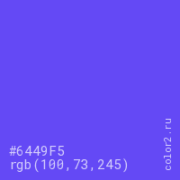 Цвет #6449F5 в цветовой модели RGB обозначается тремя октетами (100, 73, 245) в десятичном формате и #6449F5 в шестнадцатиричном (hex) формате, которые являются интенсивностью красного 100 (hex 64), интенсивность зелёного 73 (hex 49) и интенсивность синего 245 (hex F5).