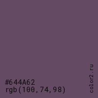 Цвет #644A62 в цветовой модели RGB обозначается тремя октетами (100, 74, 98) в десятичном формате и #644A62 в шестнадцатиричном (hex) формате, которые являются интенсивностью красного 100 (hex 64), интенсивность зелёного 74 (hex 4A) и интенсивность синего 98 (hex 62).