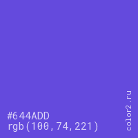 Цвет #644ADD в цветовой модели RGB обозначается тремя октетами (100, 74, 221) в десятичном формате и #644ADD в шестнадцатиричном (hex) формате, которые являются интенсивностью красного 100 (hex 64), интенсивность зелёного 74 (hex 4A) и интенсивность синего 221 (hex DD).