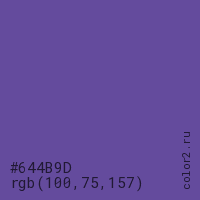 Цвет #644B9D в цветовой модели RGB обозначается тремя октетами (100, 75, 157) в десятичном формате и #644B9D в шестнадцатиричном (hex) формате, которые являются интенсивностью красного 100 (hex 64), интенсивность зелёного 75 (hex 4B) и интенсивность синего 157 (hex 9D).